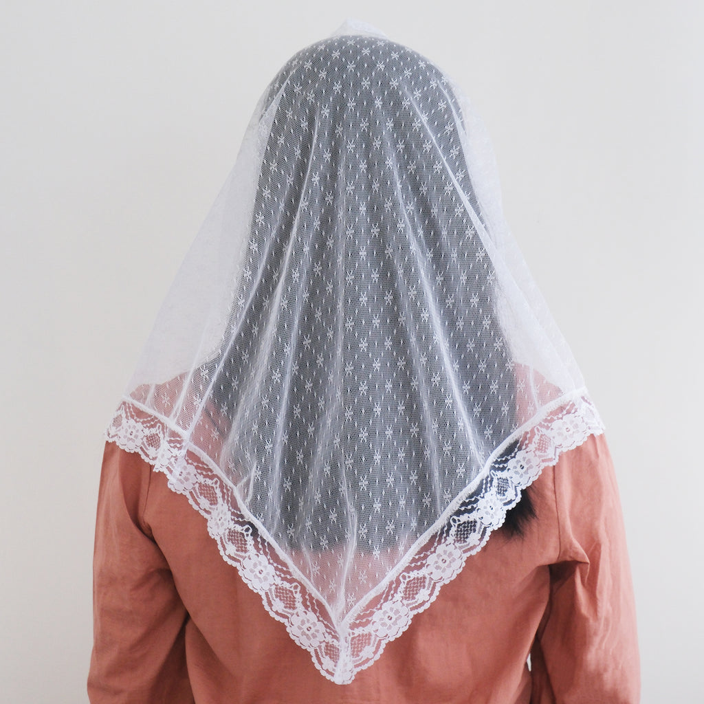 This white Catholic veil features a soft dotted pattern on a sheer tulle base. Designed in a classic triangle mantilla shape, it drapes gracefully over the shoulders and is finished with a scalloped lace edge for an elegant, timeless look.